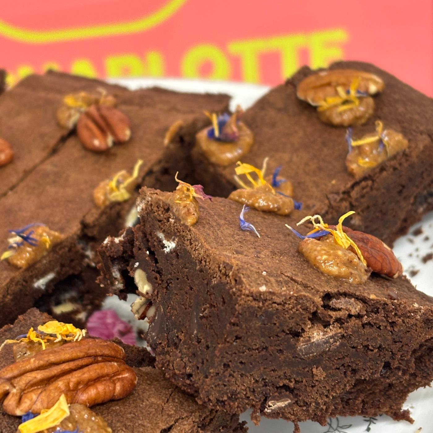 Ingrédients : beurre, sucre blanc, cassonade, oeufs, fleur de sel, farine, cacao amer, noix de pécan, chocolat noir (pâte de cacao, sucre, beurre de cacao (27 %), lécithine de soja, vanille naturelle. Peut contenir du lait) et blanc (sucre, poudre de LAIT entier (31%), beurre de cacao, émulsifiant : lécithines, arôme naturel.) Fleurs séchées comestibles.