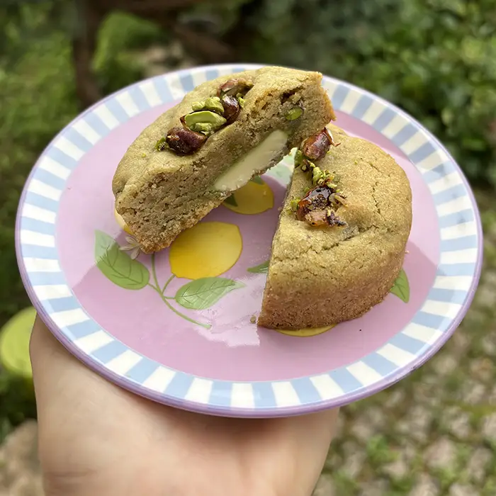 Un cookie généreux, à la fois croustillant sur les bords et délicieusement fondant en son cœur. Il cache en son sein un mariage raffiné 🤌 : le croquant délicat de la pistache de Bronte, considérée comme l’or vert de Sicile, et la douceur lactée du chocolat blanc.