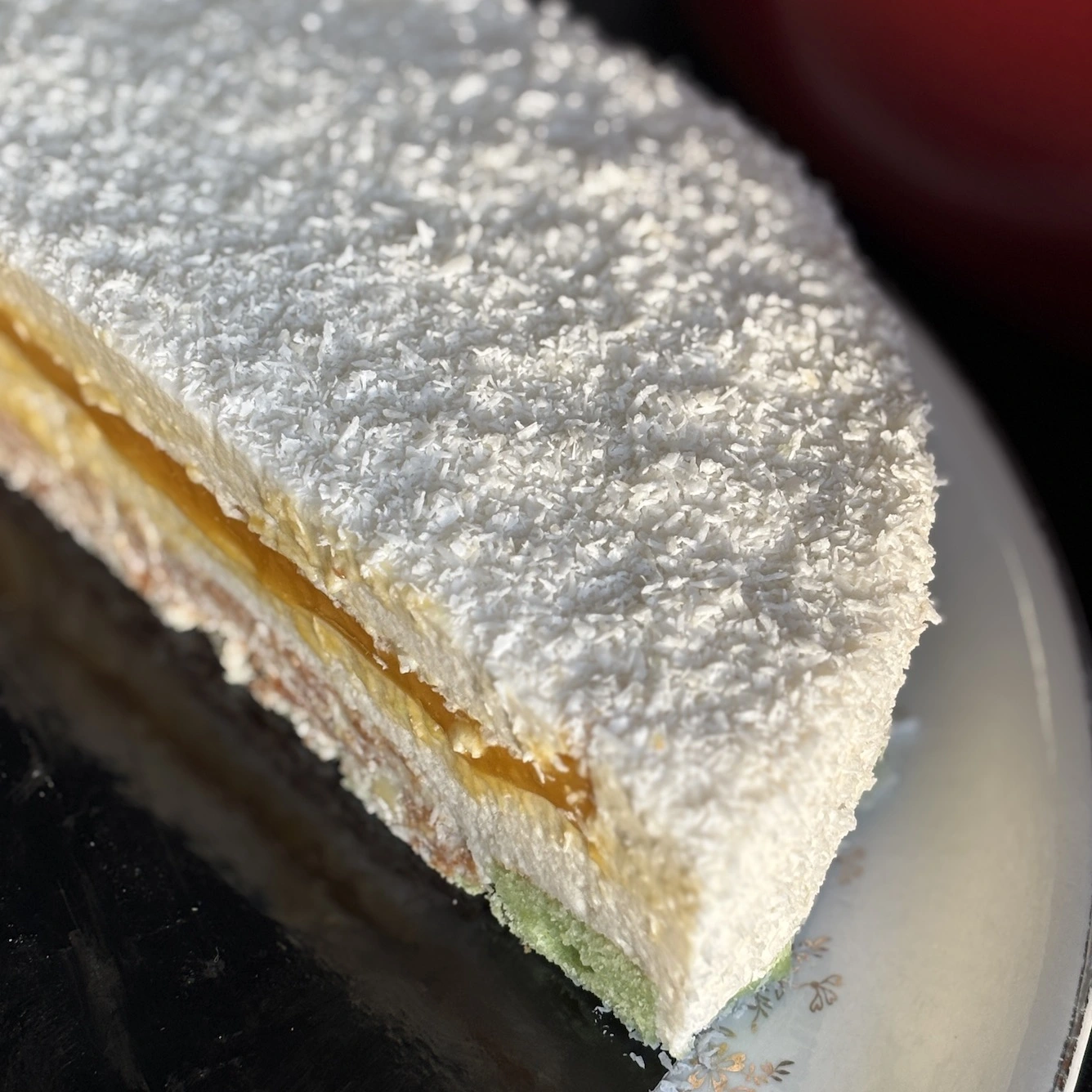 Mousse coco légère, cœur mangue-passion, chiffon cake au pandan et croustillant gavotte chocolat blanc.
